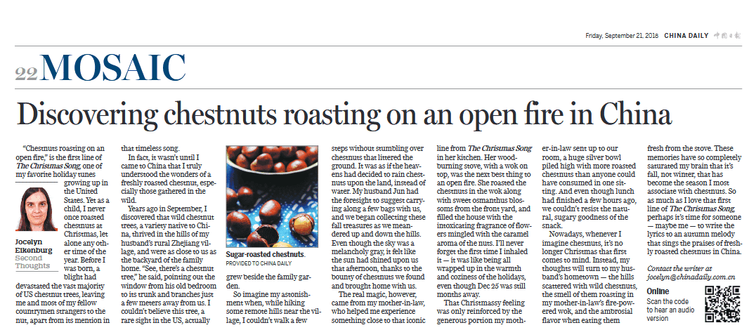 Last Friday, China Daily published my column for the month of September: Discovering chestnuts roasting on an open fire in China. Here’s an excerpt: