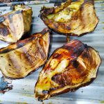 While dough is in progress, cut the eggplant into four equal pieces. Rub olive oil on the exposed meat of the eggplant, then place on an oiled baking tray. Bake for about 45 minutes to 1 hour at 230 C (450 F), flipping the pieces at least once during the process, and ensuring both sides are seared. Let cool for about 5-10 minutes