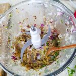 Add the remaining half the garlic and the cilantro to a food processor, along with the lemon juice. Then add in eggplant, onion, tahini, 10 g of olive oil and 1.5 g of salt. Pulse it until the eggplant mixture has the consistency of a paste; the onion may still be in small chunks or pieces, which is fine.