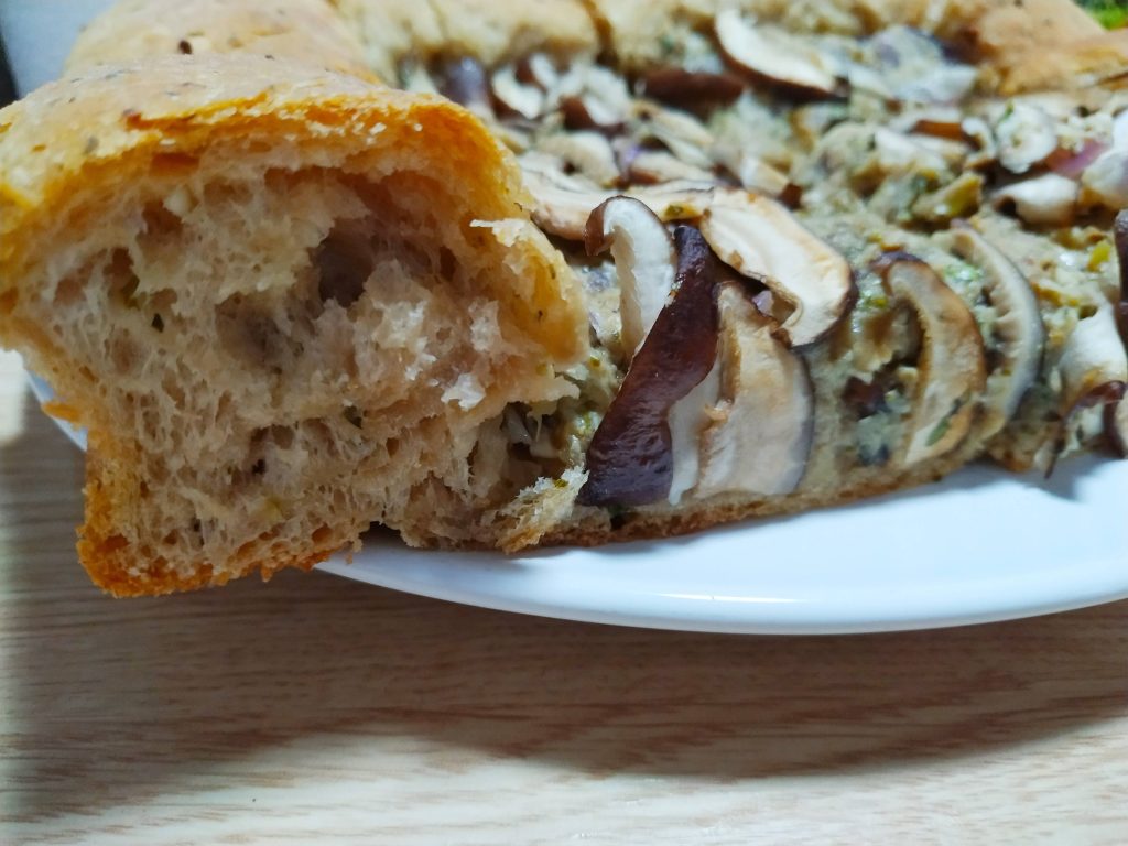 Fragrant cilantro in the dough, a savory eggplant sauce and shiitake mushrooms as a topping make for a uniquely delectable pizza that's vegan and also echoes flavors of the East and West. Make the dough in your bread machine for an easy pizza night at home!